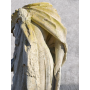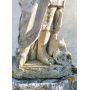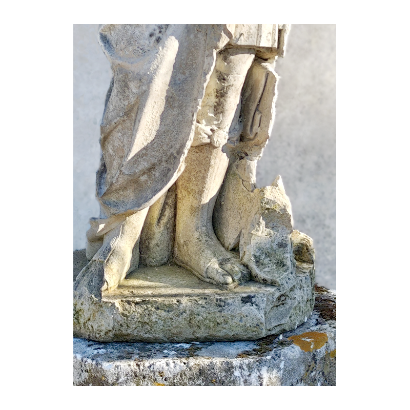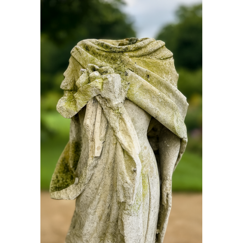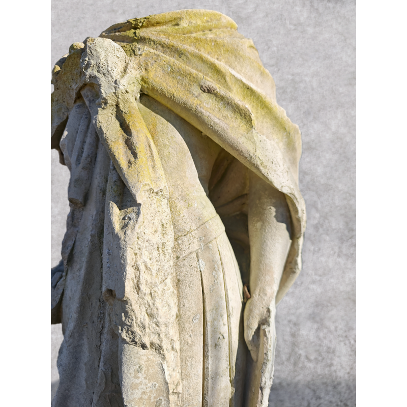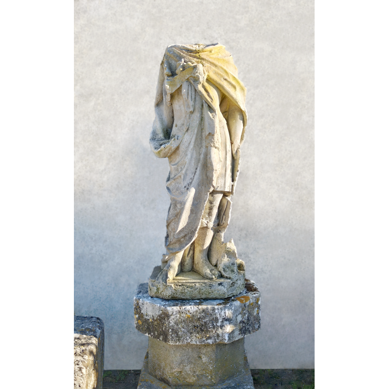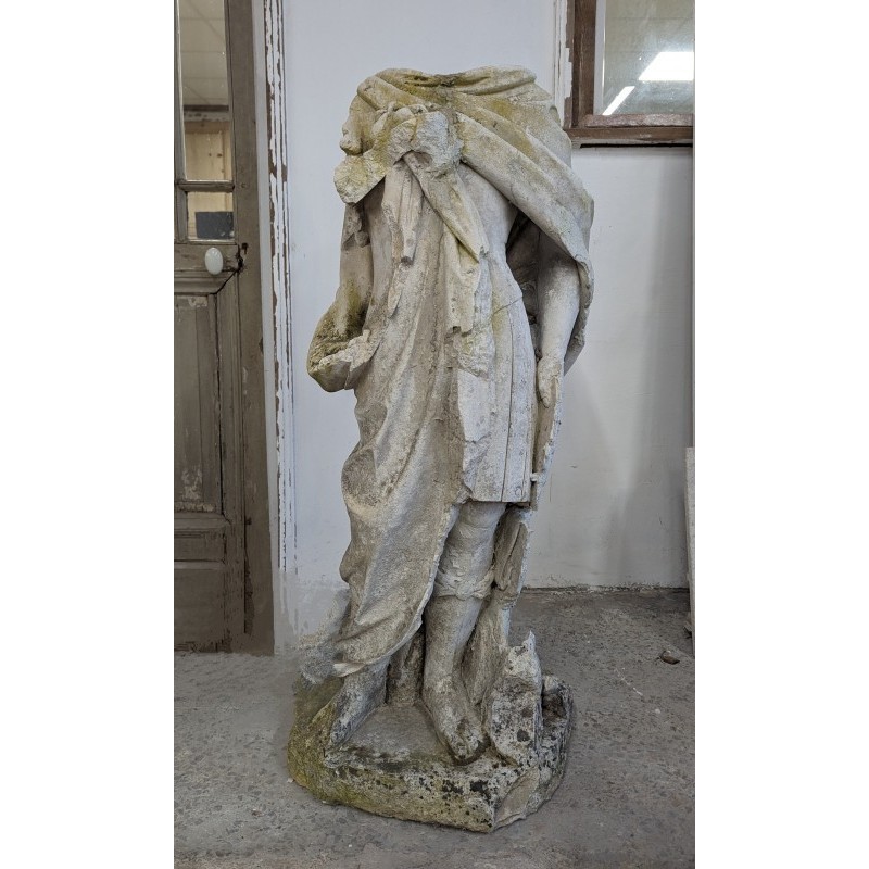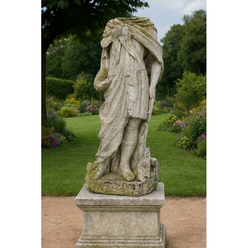 A stone statue in the antique style, depicting a man wearing a draped cape.