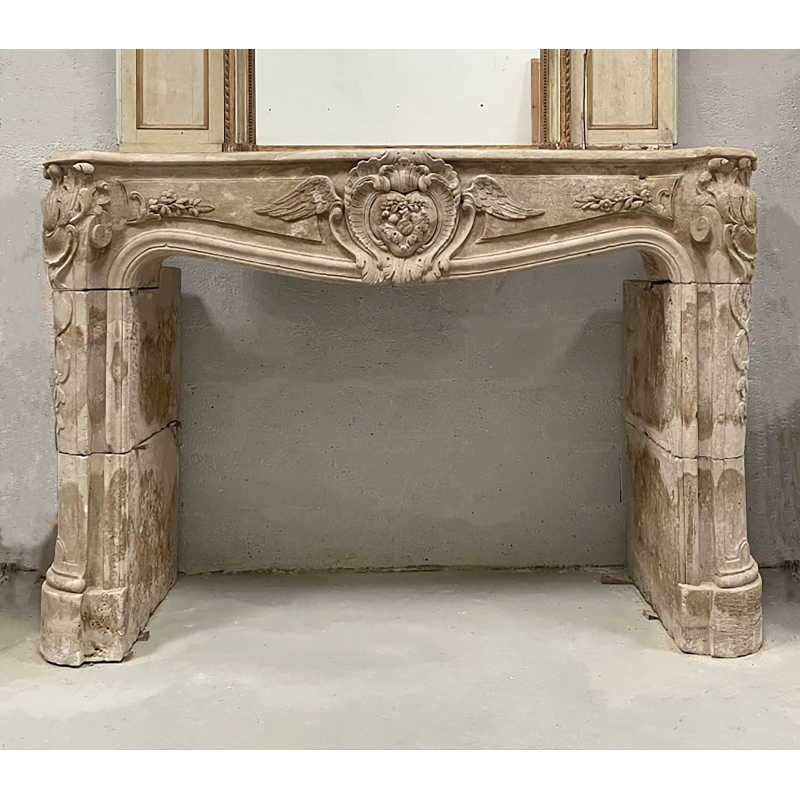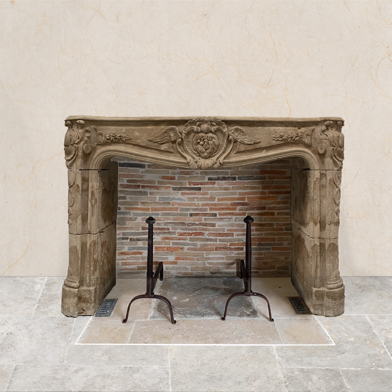 Low limestone fireplace from the Louis XV period, decorated with scrolls and foliage. In the center of the lintel is a heart-shaped medallion surrounding a floral composition, framed by rocaille scrolls and outstretched wings.