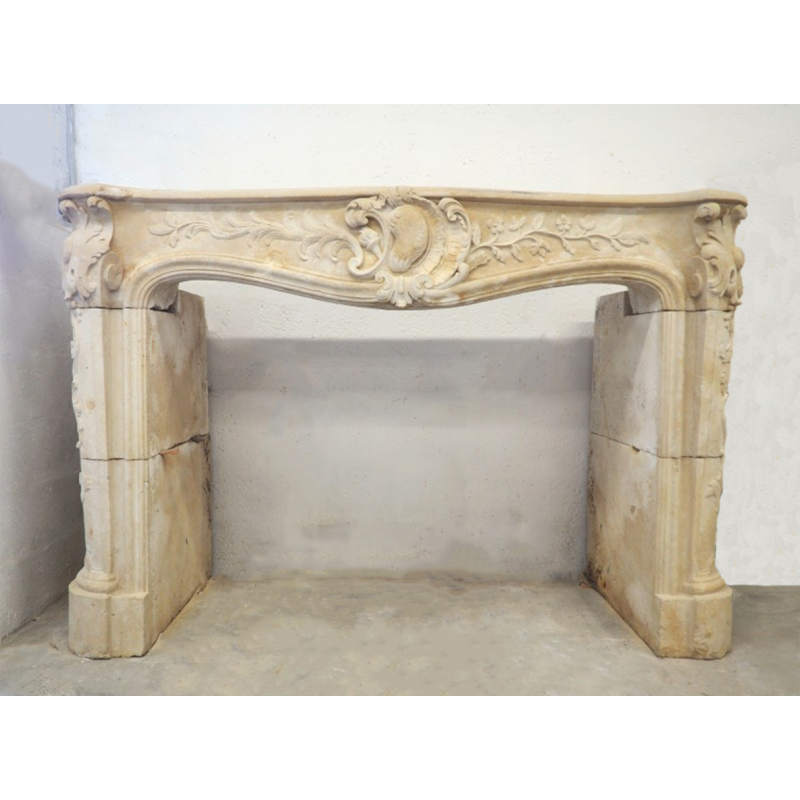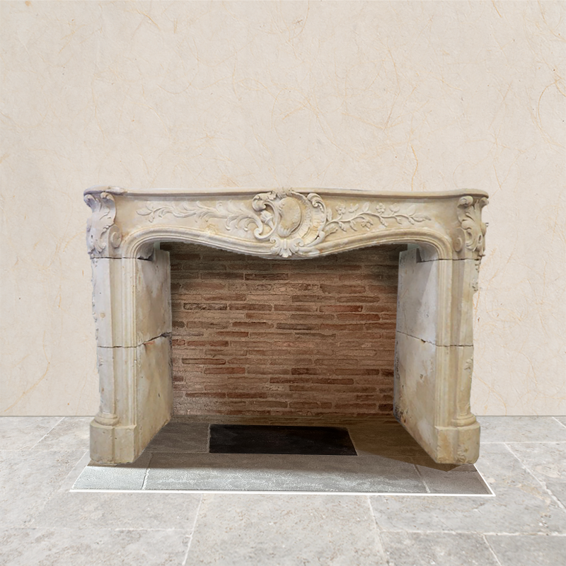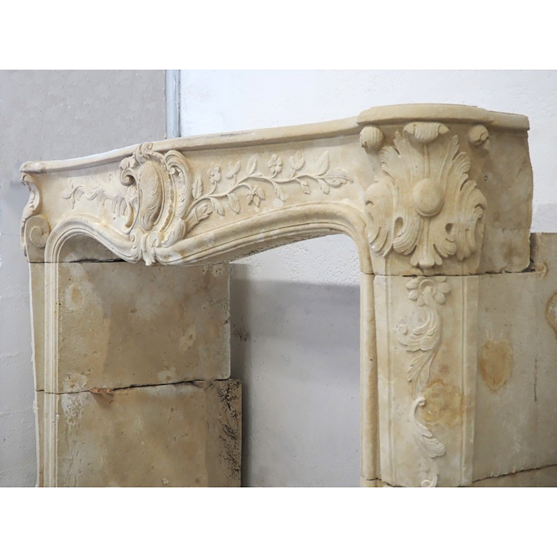 Low Louis XV period fireplace with scroll and foliage decorations. In the center of the lintel is a plant motif, evoking a seed, symbol of abundance and regeneration, surrounded by foliage and flowering branches.