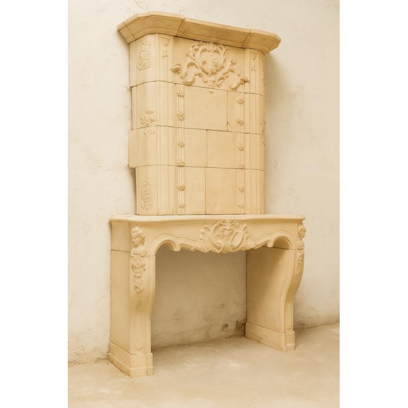 Cheminée à trumeau sculptée de style Régence. Copie selon le modèle du musée de Saint Jean d'Angély.