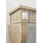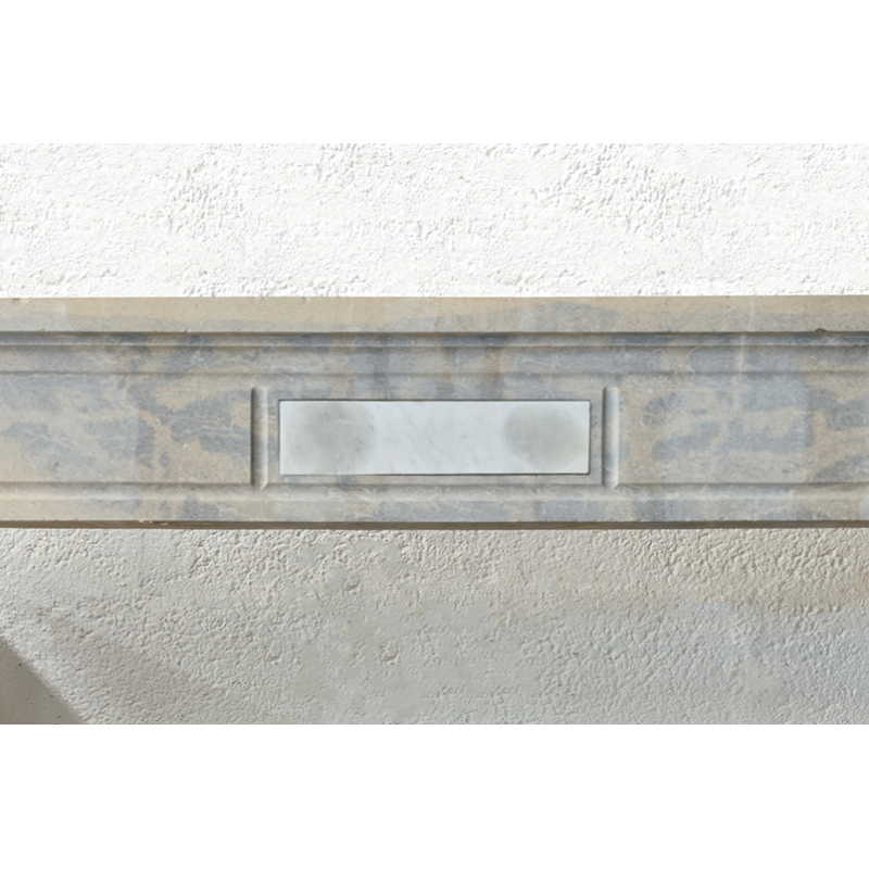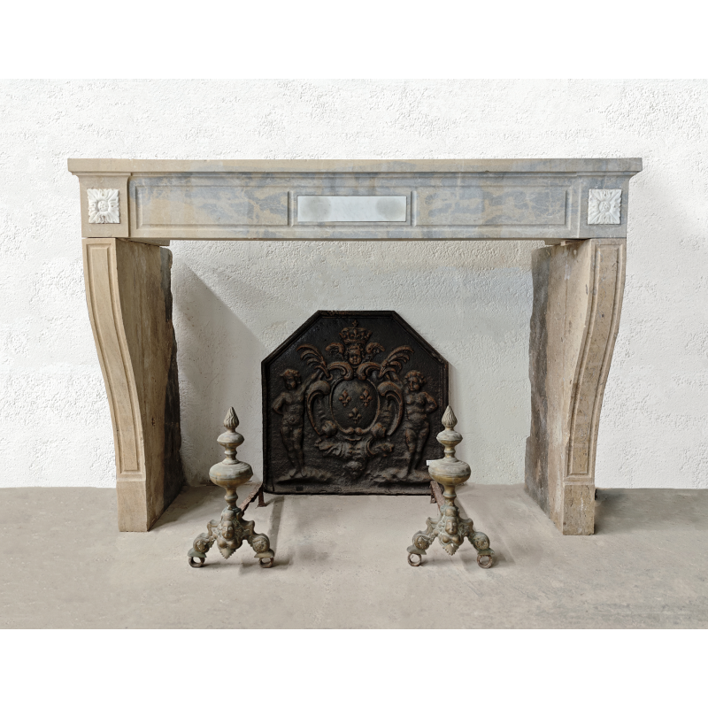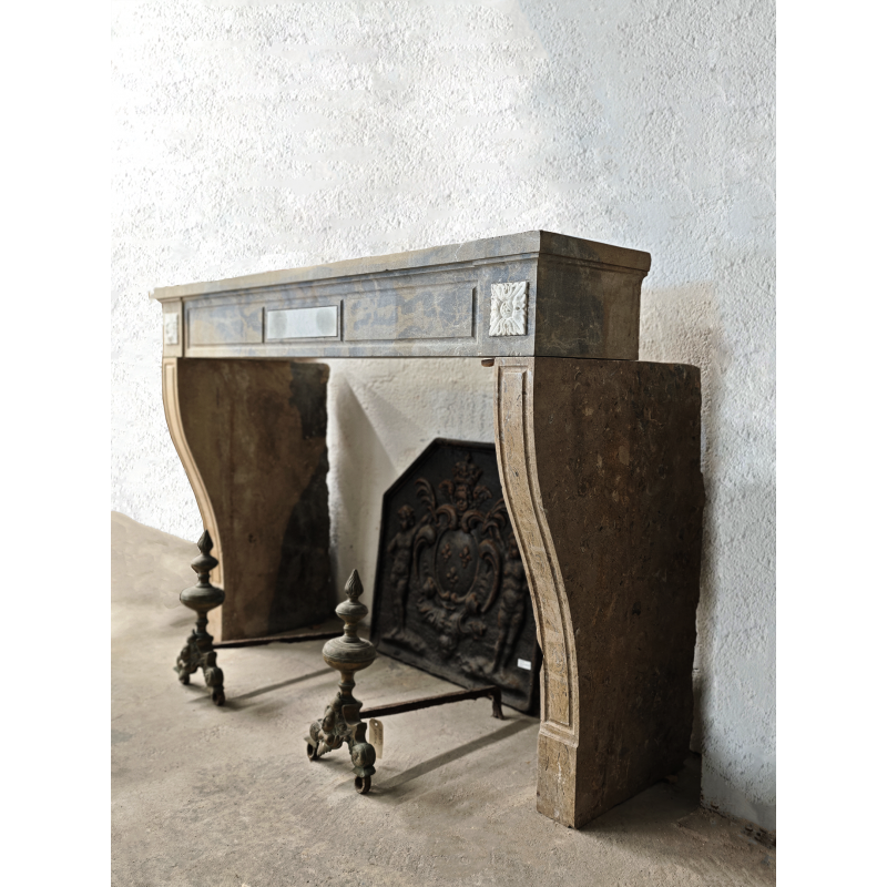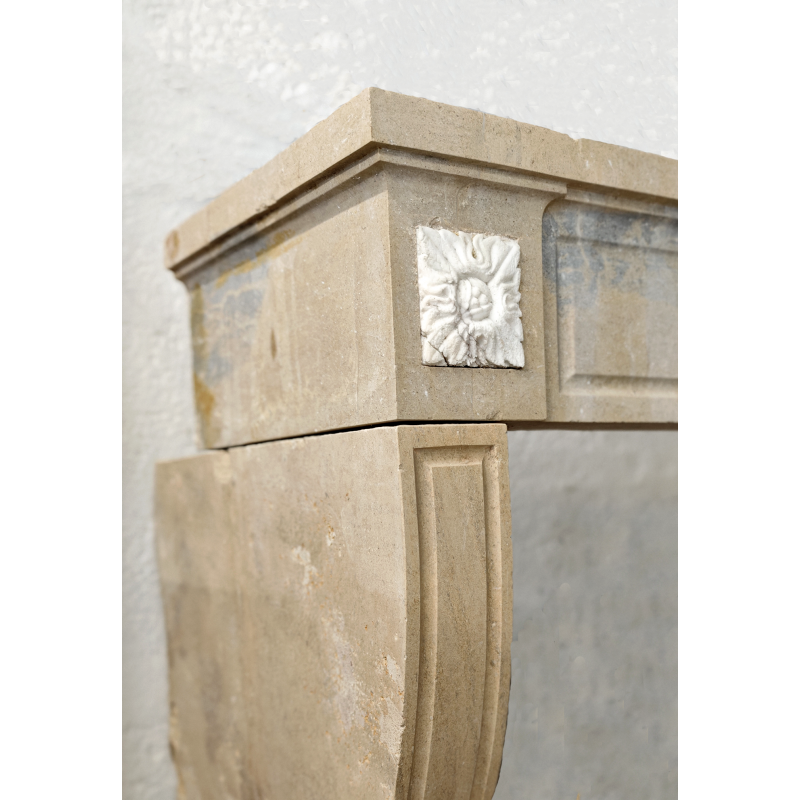 Cheminée en pierre marbrière, style Louis XVI, présentant une légère courbure au niveau des jambages et un ornement floral élégant aux extrémités du linteau.