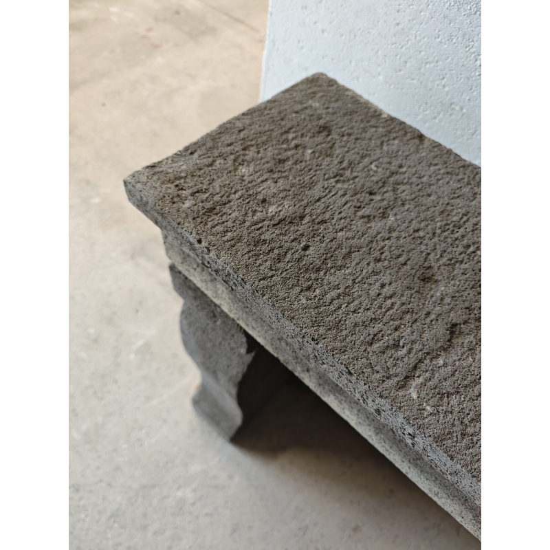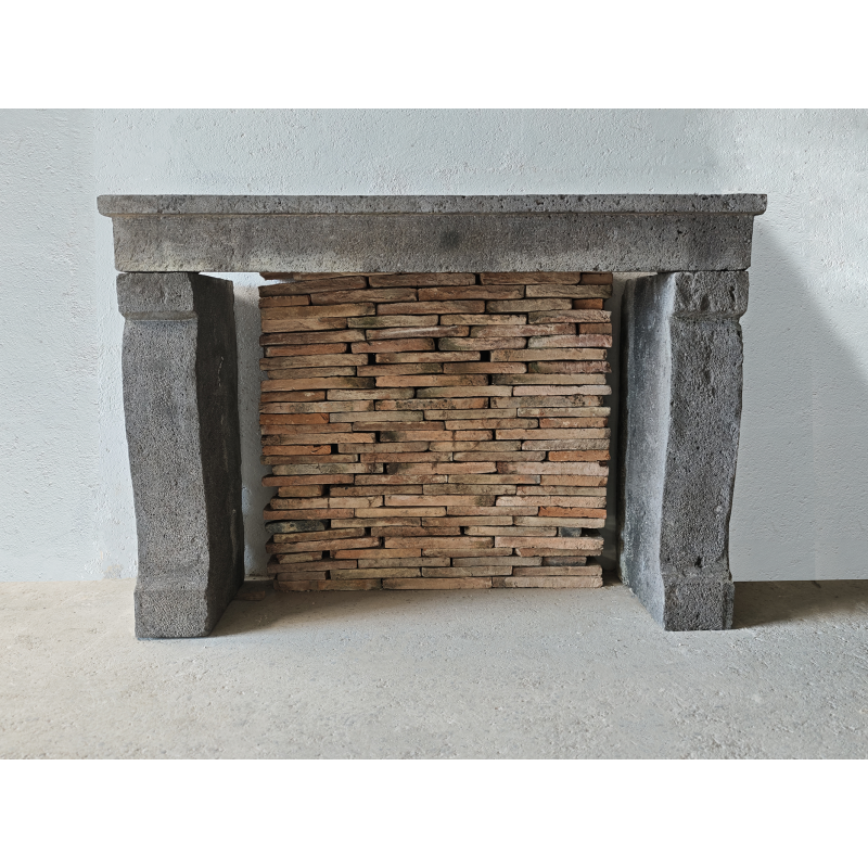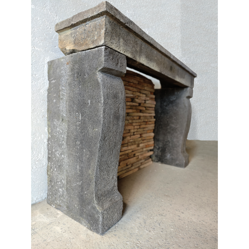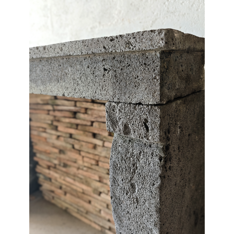 Cette cheminée ancienne en pierre de Volvic présente une pierre volcanique grise avec une esthétique unique. Son caractère minéral et rustique offre une silhouette sobre et authentique.