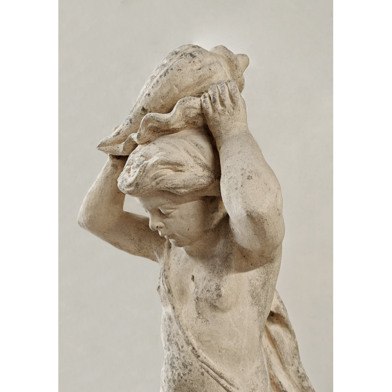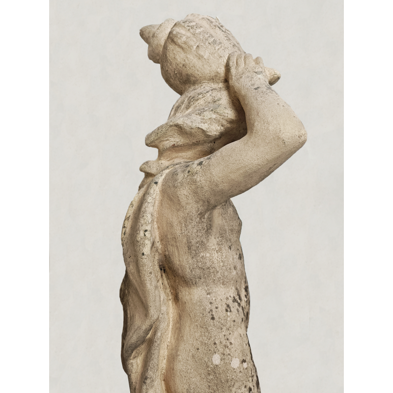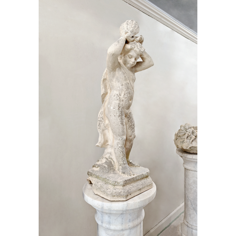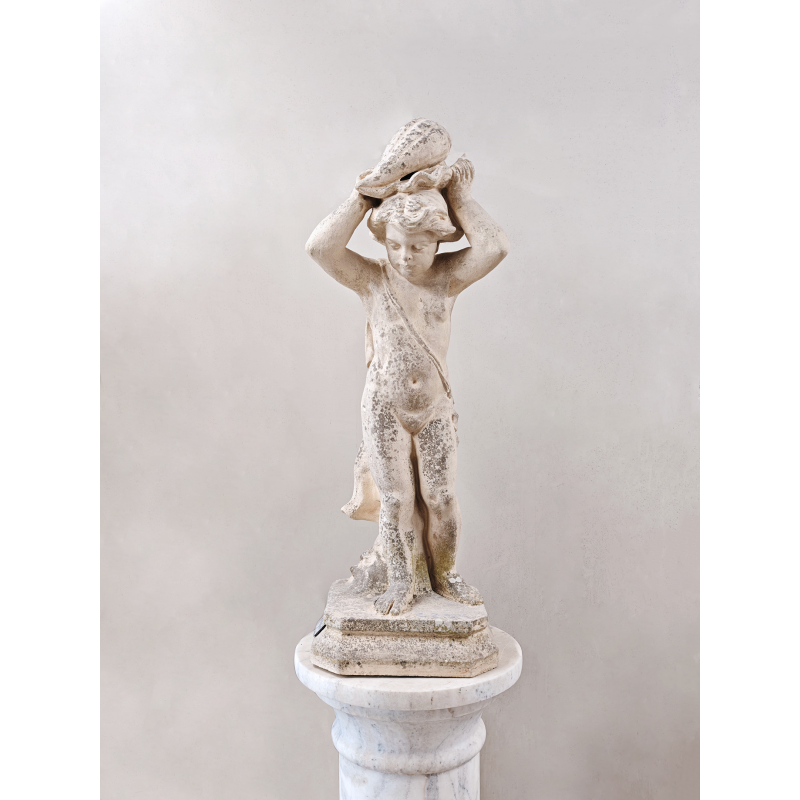 Charmante sculpture en pierre reconstituée datant du XXème siècle. Celle-ci représente un enfant tenant un coquillage au-dessus de sa tête, dans une posture à la fois gracieuse et vivante. Les proportions équilibrées, les courbes douces et les détails du visage comme du drapé témoignent d’un beau travail de sculpture. Une sculpture pleine de poésie et de caractère, qui capte le regard sans jamais en faire trop.