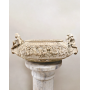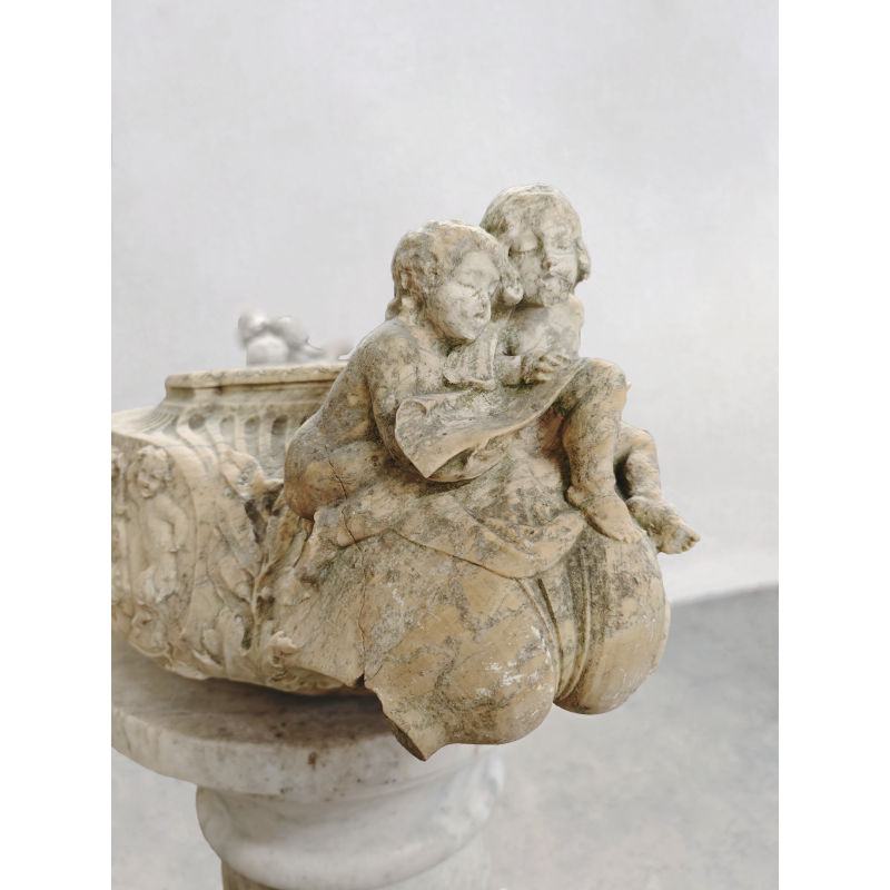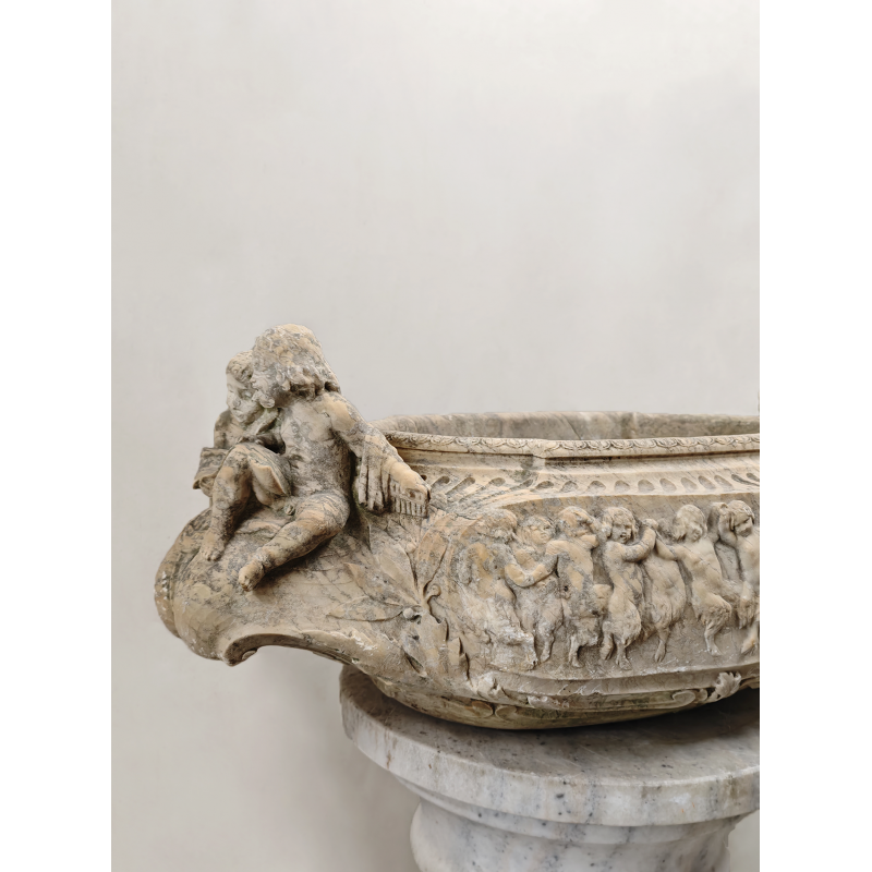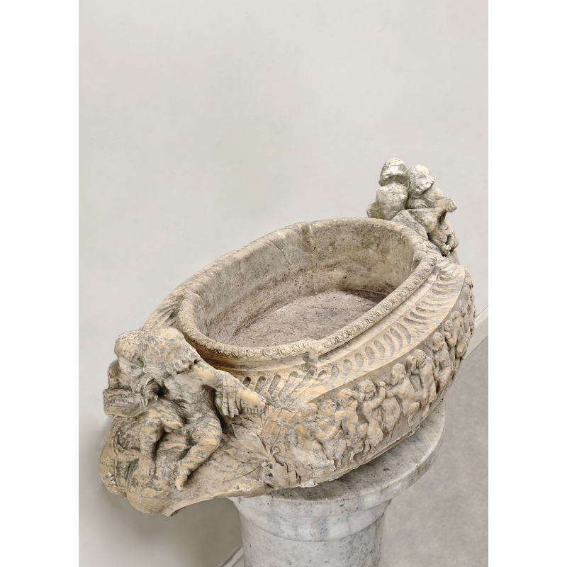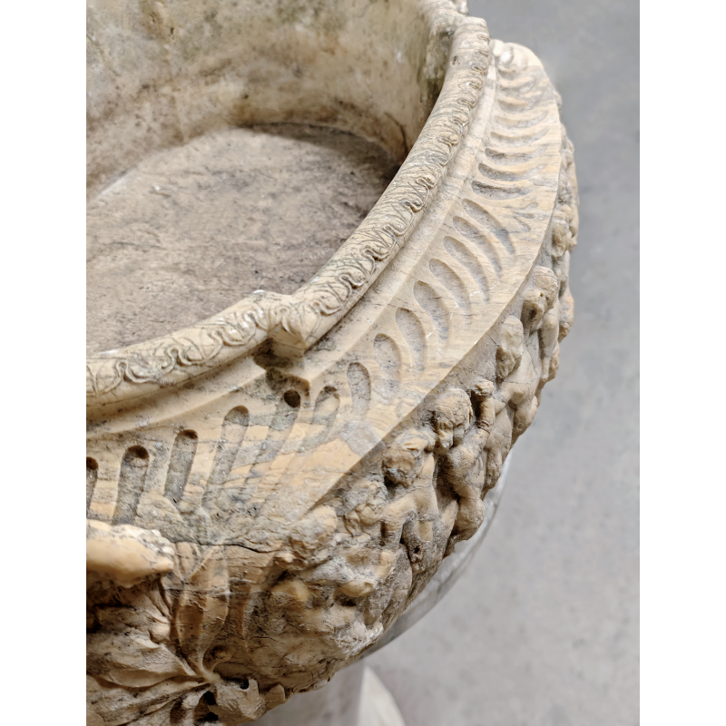 Importante vasque ovoïde en marbre clair, finement sculptée en haut relief sur toute sa périphérie, provenant certainement d'Italie.
