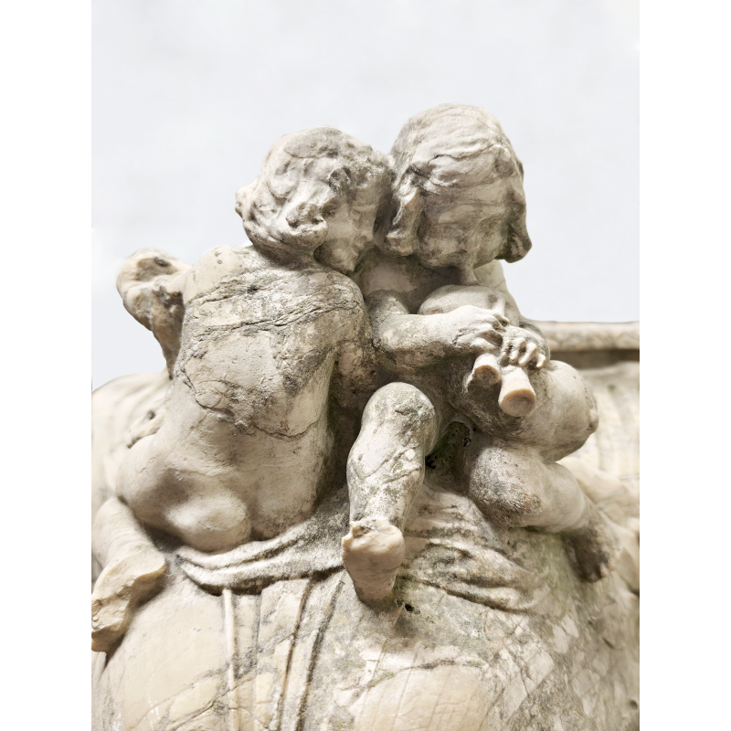 Les anses latérales sont constituées de groupes de putti assis, formant des mascarons en léger débordement :
