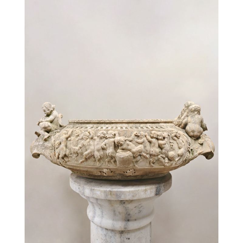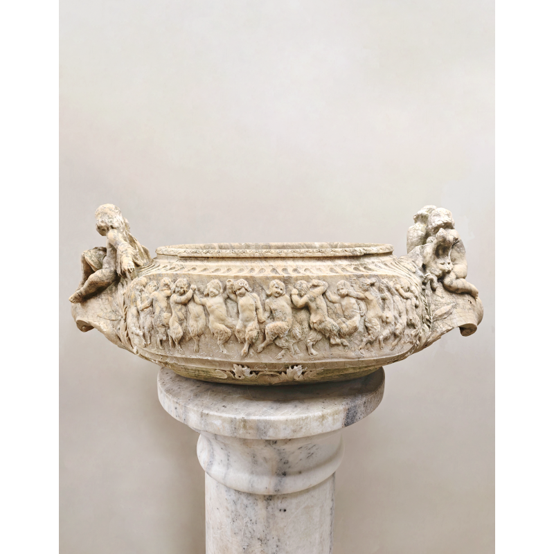 Chaque face est ornée d’un frise animée de putti aux pieds caprins, engagés dans une ronde joyeuse autour d’attributs bachiques : tambourins, jarres et guirlandes végétales.
