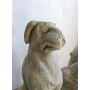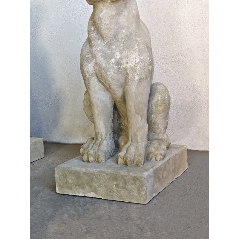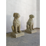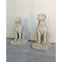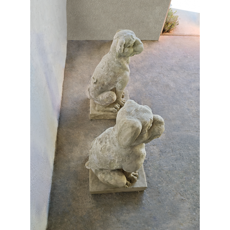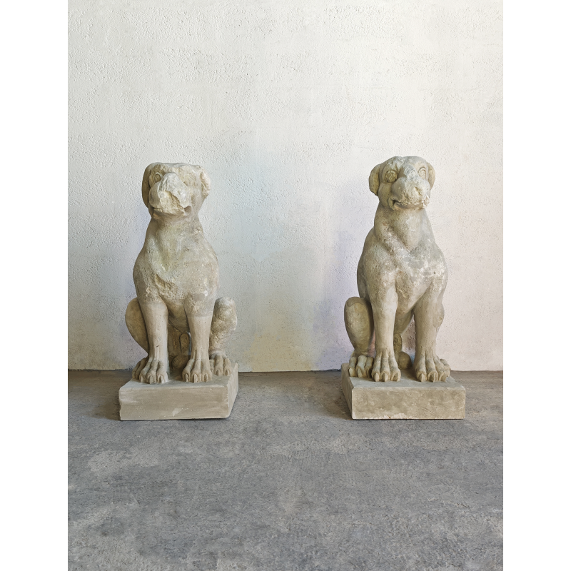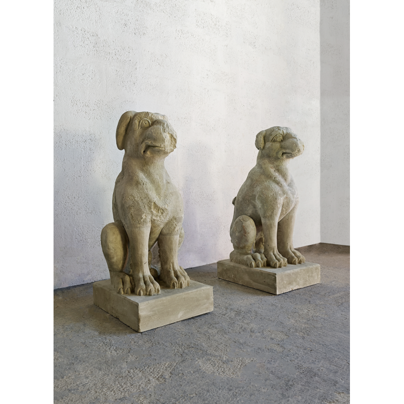 Cette belle paire de sculptures représente des chiens assis, réalisées en pierre, reposant chacune sur un socle rectangulaire intégré, date de la fin XVIIe siècle. Ces statues présentent une silhouette expressive et légèrement stylisée, avec un travail marqué sur les volumes (tête, pattes, poitrail) qui leur donne beaucoup de présence. La pierre a développé avec le temps une patine naturelle : nuances, traces d’usure et micro-érosions qui renforcent leur caractère authentique.