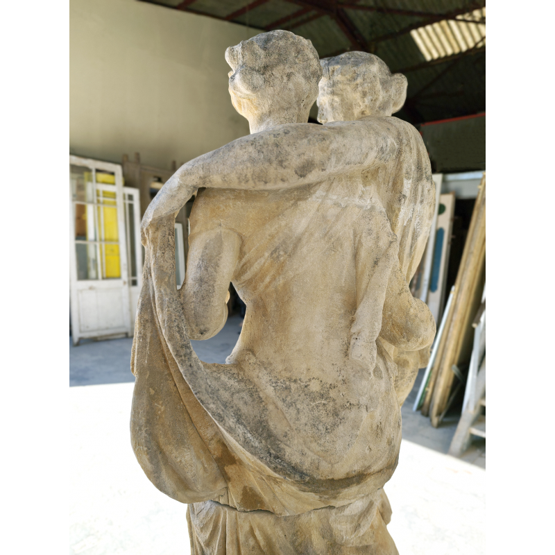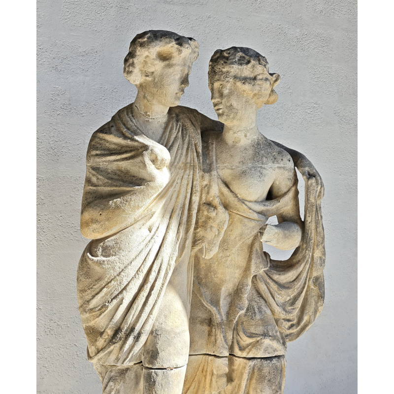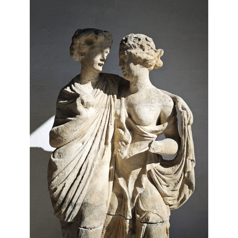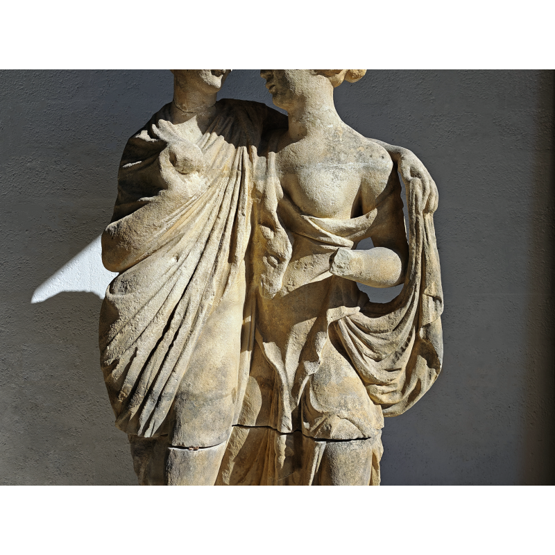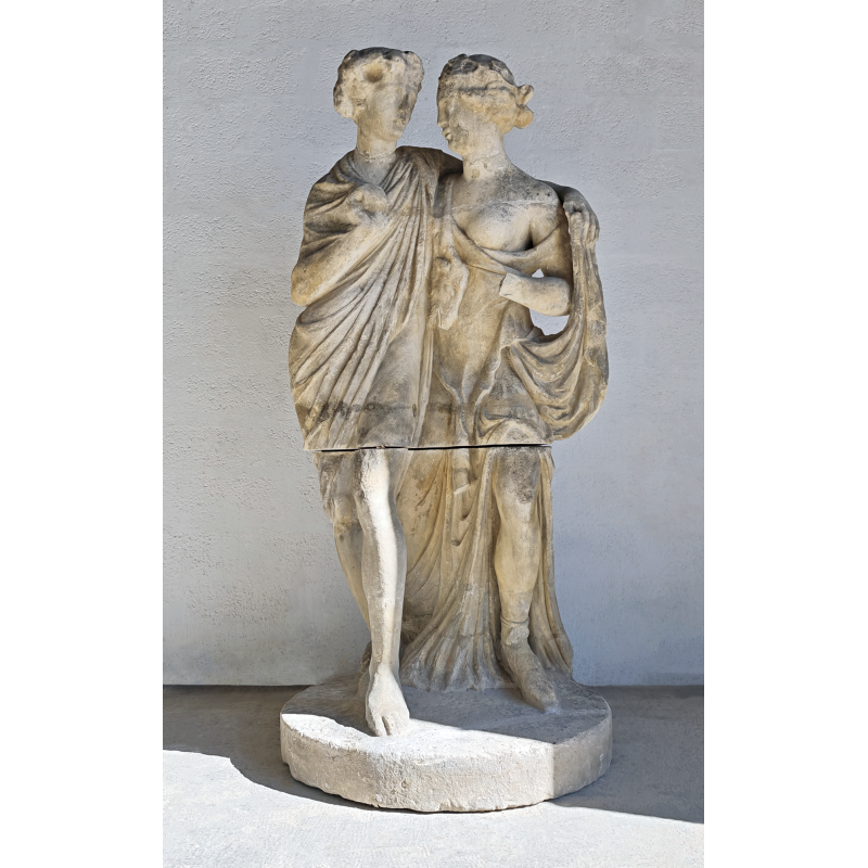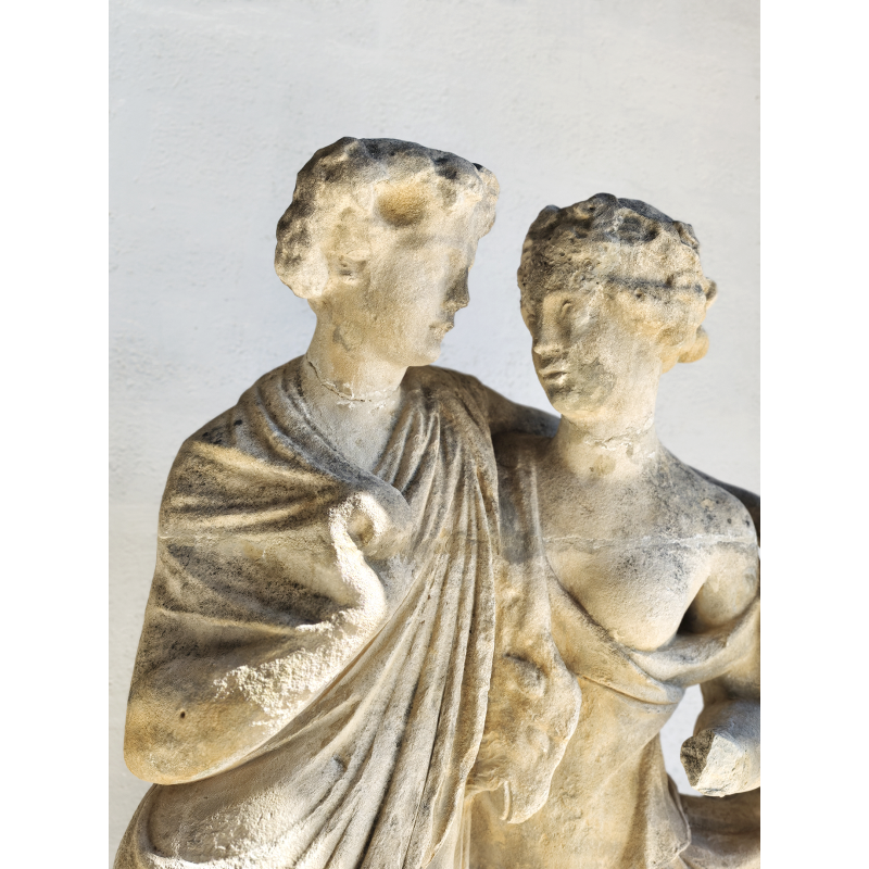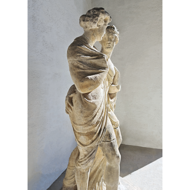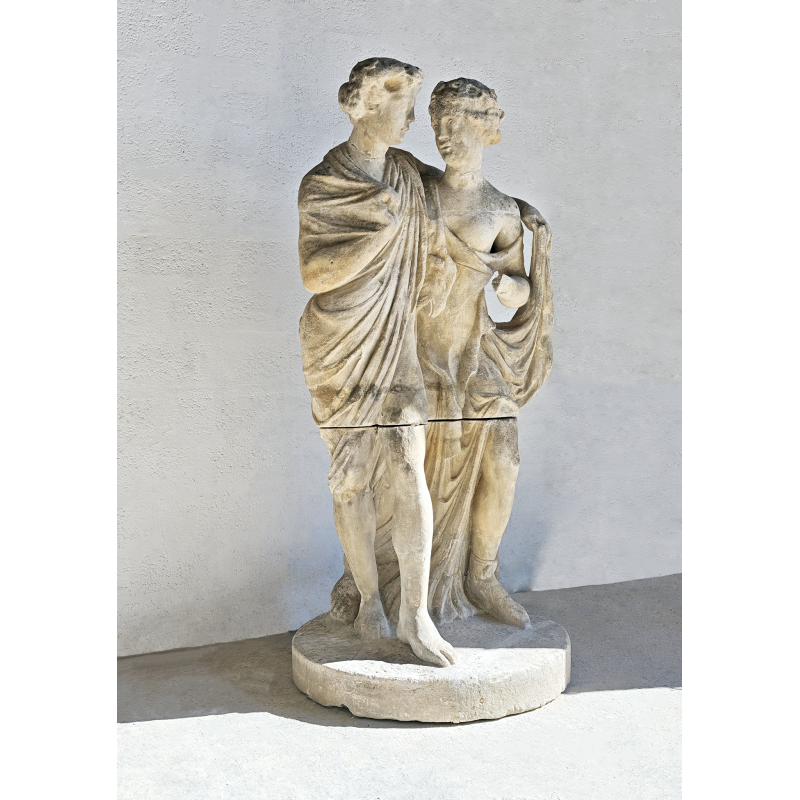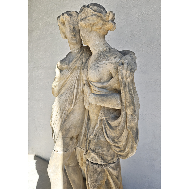 Élégante statue en pierre représentant deux figures enlacées, dans un style inspiré de l’Antiquité classique. La composition met en scène un duo harmonieux, aux attitudes douces et naturelles, évoquant les thèmes de la complicité, de l'amour, de l’amitié ou encore de l’allégorie. La présence d’une dépouille animale avec une tête de bélier, portée par l’une des figures, évoque les codes iconographiques du monde bacchique (Dionysos/Bacchus), conférant à la sculpture une lecture symbolique liée à la nature, à la fertilité et à l’abondance.