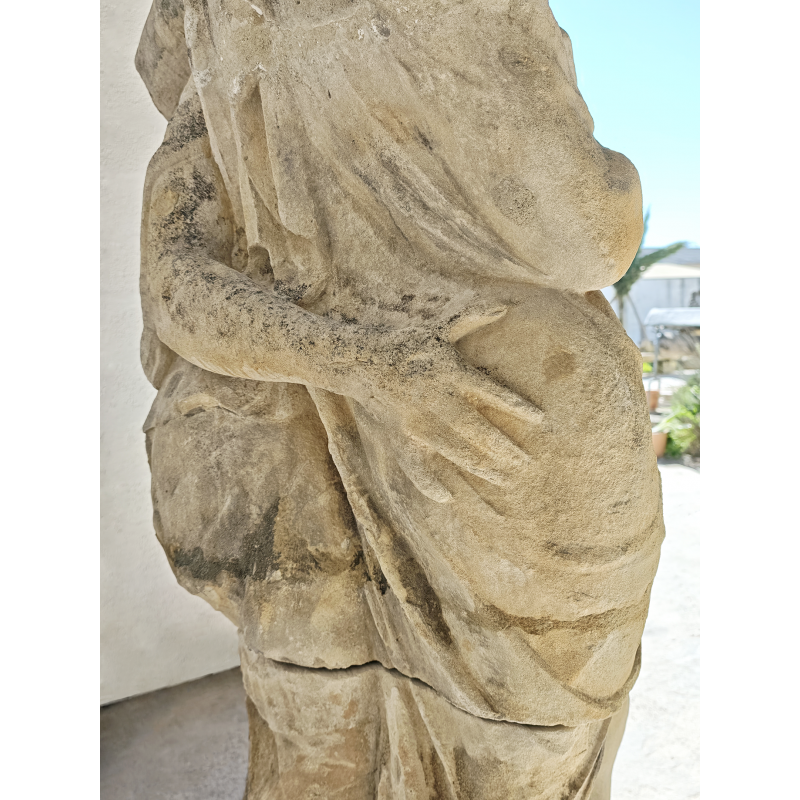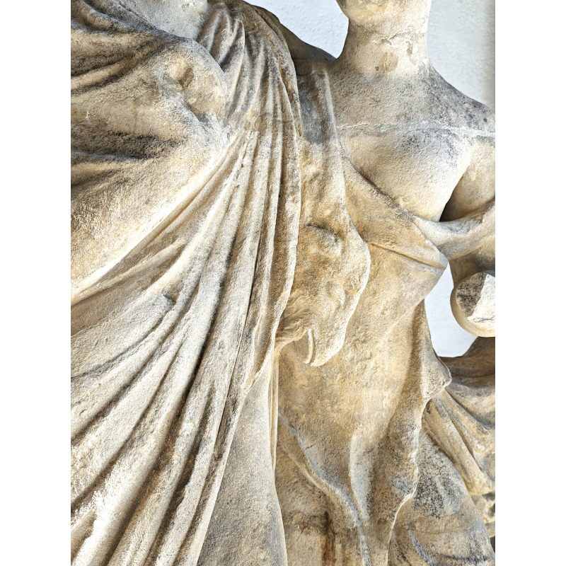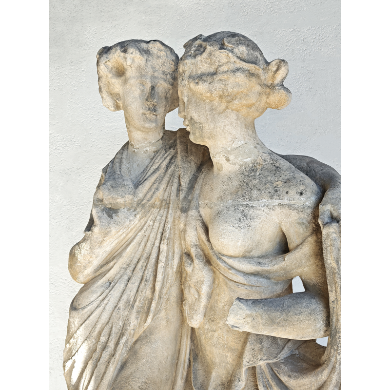 Les drapés sont finement travaillés, avec de beaux jeux de plis qui apportent du mouvement à l’ensemble. Les corps sont traités avec sobriété, dans une esthétique classique où les volumes priment sur le détail. Cette statue est donc parfaite pour un jardin, un parc ou bien une cour intérieure, pour une mise en scène ou un élément central décoratif haut de gamme.