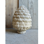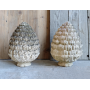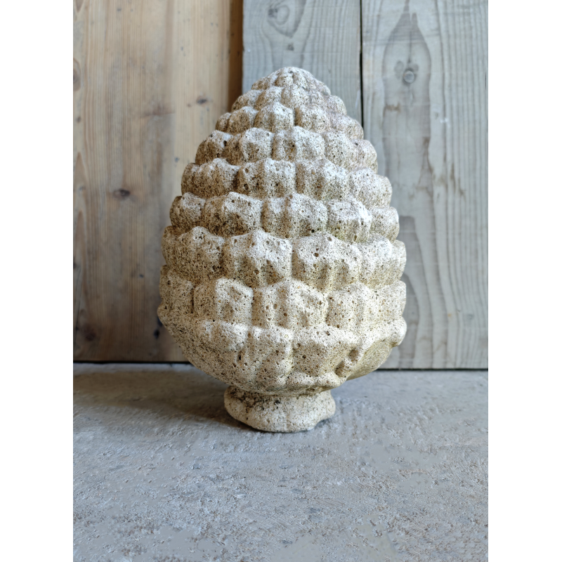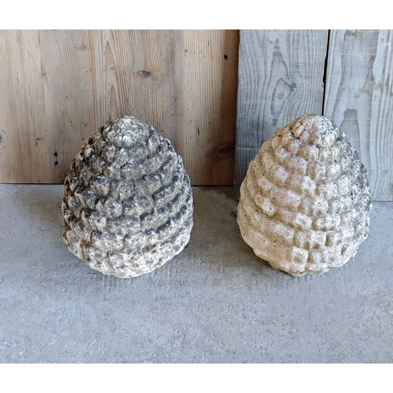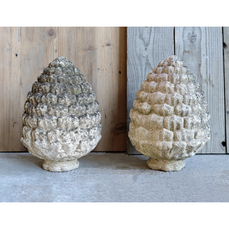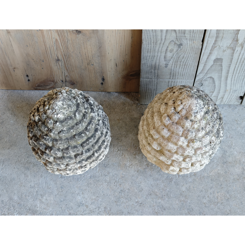 Belle paire d’éléments décoratifs en pierre reconstituée sculptée représentant des pommes de pin, symbole classique de prospérité et d’accueil. Les volumes sont généreux, avec un travail en relief bien marqué qui capte la lumière et donne du rythme à la surface. Chaque pièce présente une patine naturelle différente et toutes deux sont montées sur un petit socle qui leur permet d'être stables et faciles à intégrer. Ces éléments décoratifs sont typiquement le genre d’élément architectural que l’on retrouve sur des portails anciens, ce qui leur confère de suite du cachet.