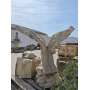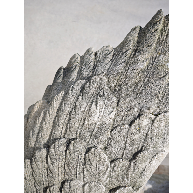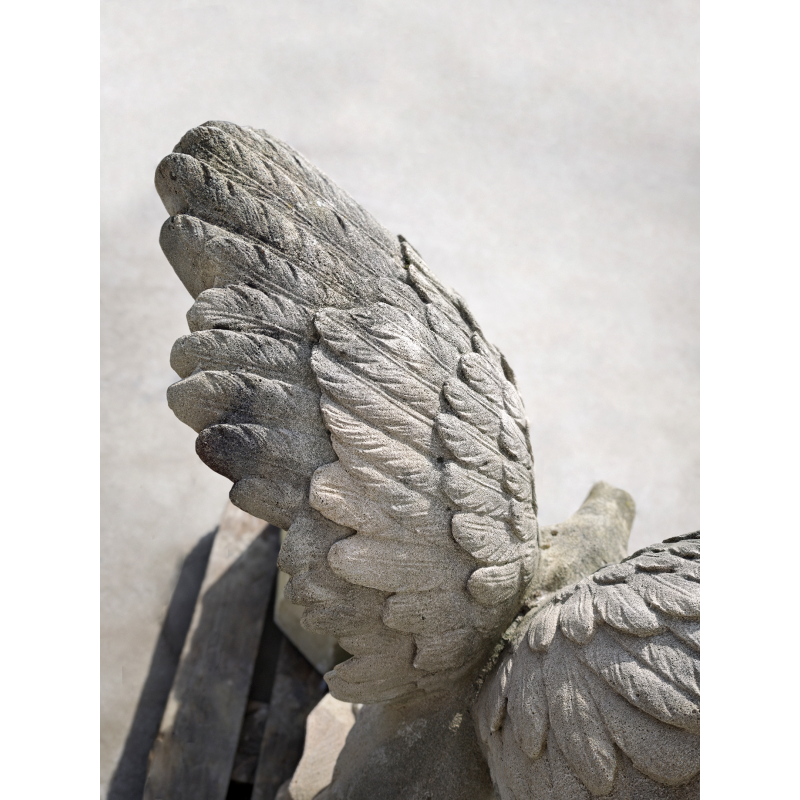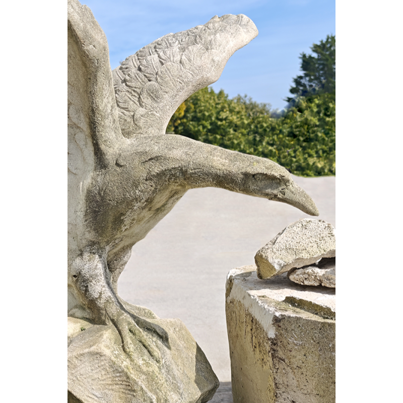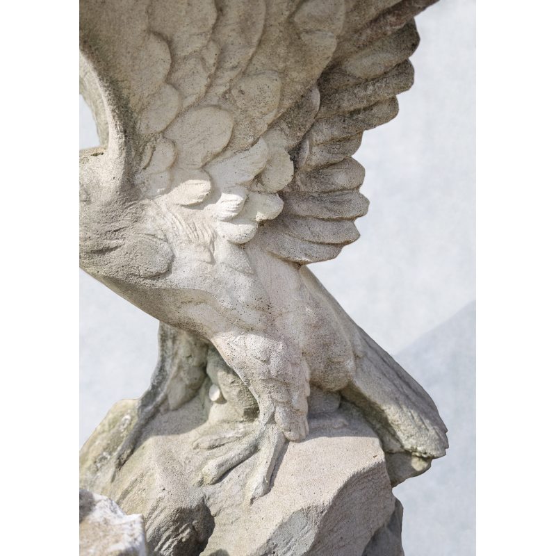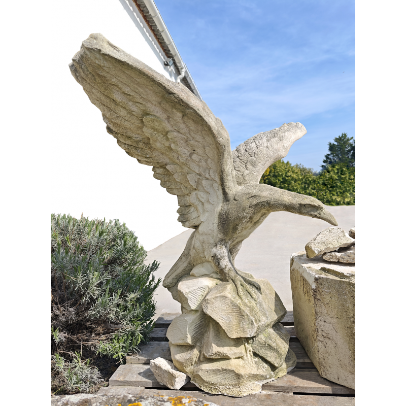 Belle statue d’aigle aux ailes déployées, réalisée en pierre reconstituée, représentant l’oiseau en position d’atterrissage ou de prise. La composition est dynamique : ailes largement ouvertes, corps incliné vers l’avant, serres posées sur un socle rocheux. L’ensemble dégage une vraie sensation de mouvement. De plus, nous pouvons admirer un plumage bien marqué par le relief et une tête expressive, ce qui donne une réelle présence à cette pièce décorative.