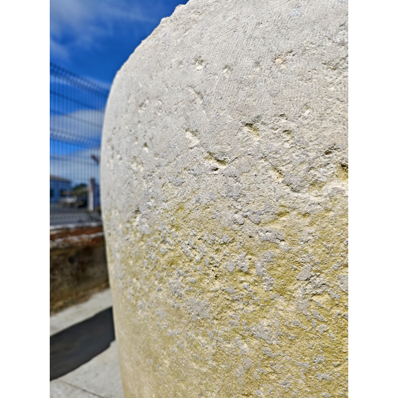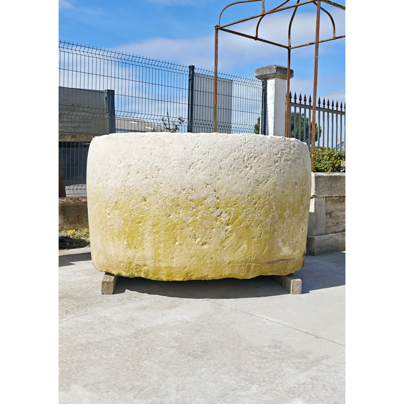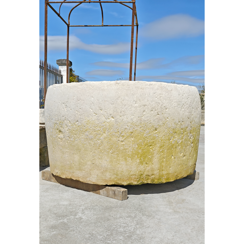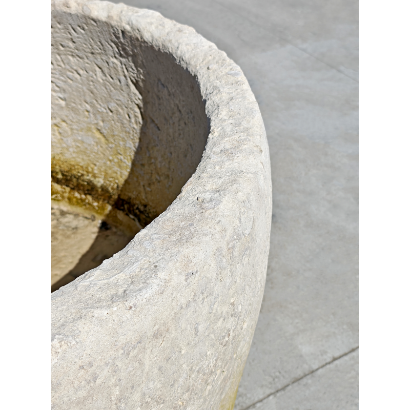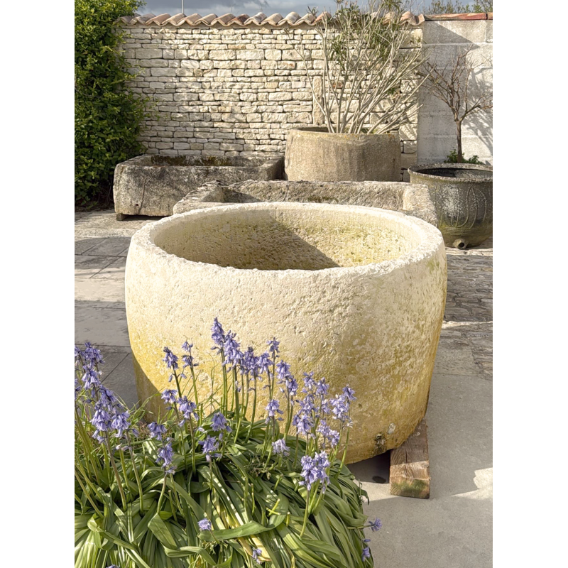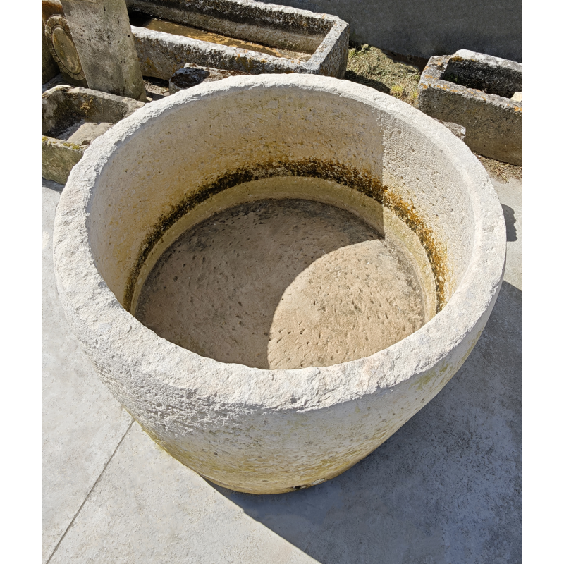 Superbe ponne ancienne taillée dans une pierre claire (diamètre de 135cm / diamètre intérieur de 117cm), présentant une belle patine naturelle. Son aspect légèrement irrégulier, ses traces d’usage et ses nuances allant du blanc au jaune doré témoignent de son authenticité et de son histoire. De belles proportions et une forme simple mais puissante qui en font une pièce décorative forte, idéale en extérieur comme en intérieur.