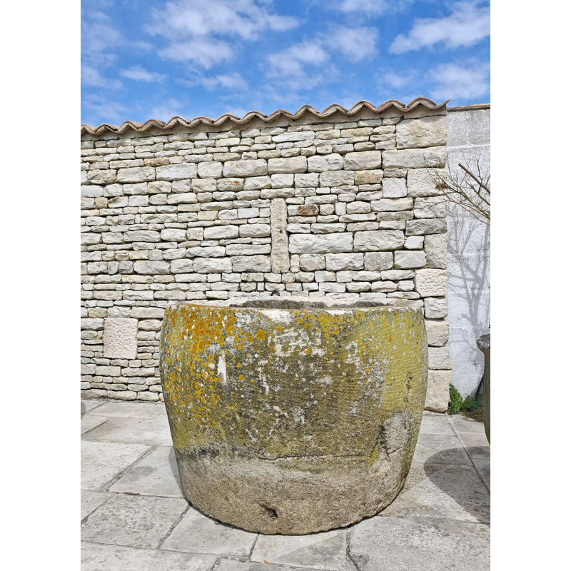 La pierre est superbement patinée, avec une riche palette de teintes naturelles allant du beige au gris, ponctuée de lichens jaunes et de traces du temps qui renforcent son authenticité. On note également une évacuation en partie basse, élément typique qui permet aujourd’hui encore un usage en jardinière, bassin ou élément de fontaine.