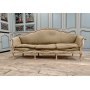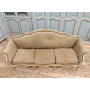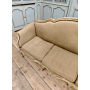 L’assise et le dossier sont garnis d’un tissu dans des tons chauds et naturels, offrant un bel équilibre entre confort et esthétique. Les coussins, amples et accueillants, soulignent le côté vivant et authentique de la pièce. Néanmoins, il est à prévoir des retouches ou un changement de tissu.