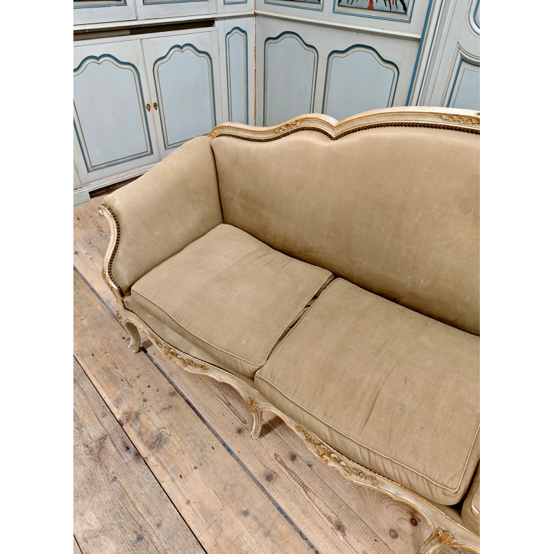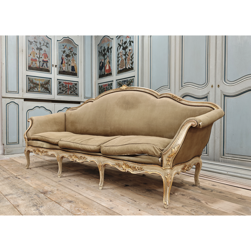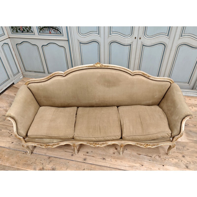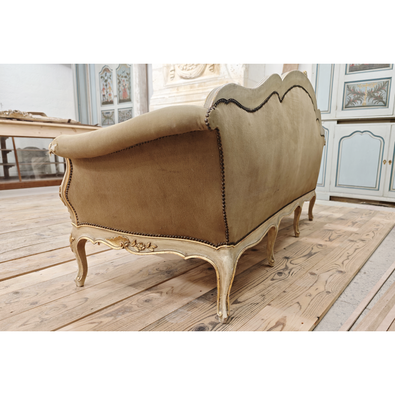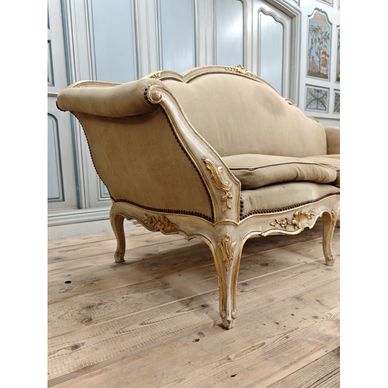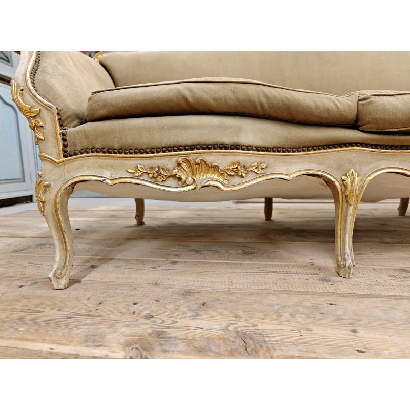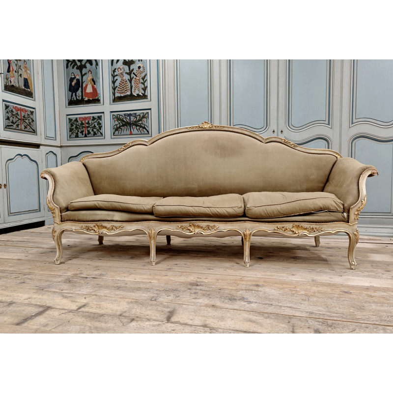 Élégante banquette ancienne de style Louis XV, au galbe raffiné et aux lignes généreuses, parfaite pour apporter du caractère à un intérieur. Sa structure en bois sculpté, richement moulurée et partiellement dorée, présente de délicats décors floraux et coquilles, typiques du style. La patine, légèrement usée par le temps, renforce son charme sans rien enlever à sa finesse. Reposant sur des pieds cambrés élégants, cette banquette combine légèreté visuelle et présence décorative forte.