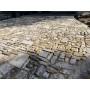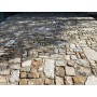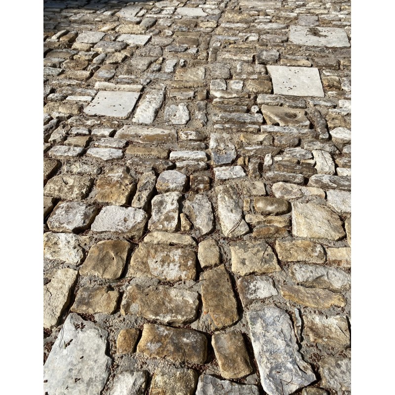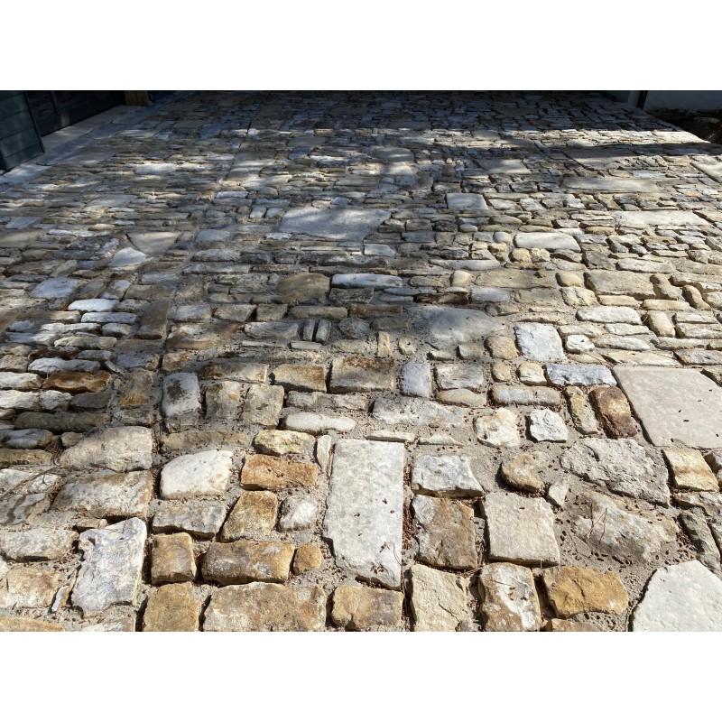 Présentation d'un sol avec un mélange de pavés d'écurie et de dallages anciens (100 m² disponibles).