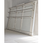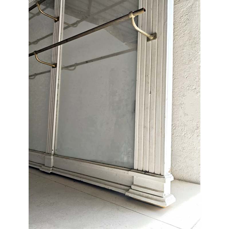 Grand miroir mural de magasin en bois peint, surmonté de trois barres en laiton.