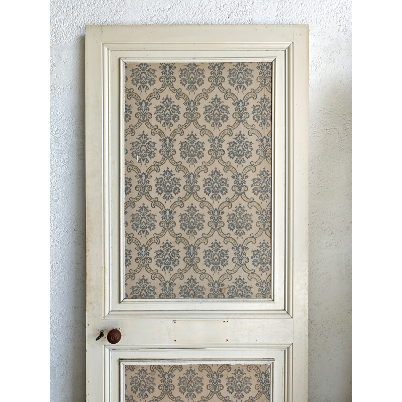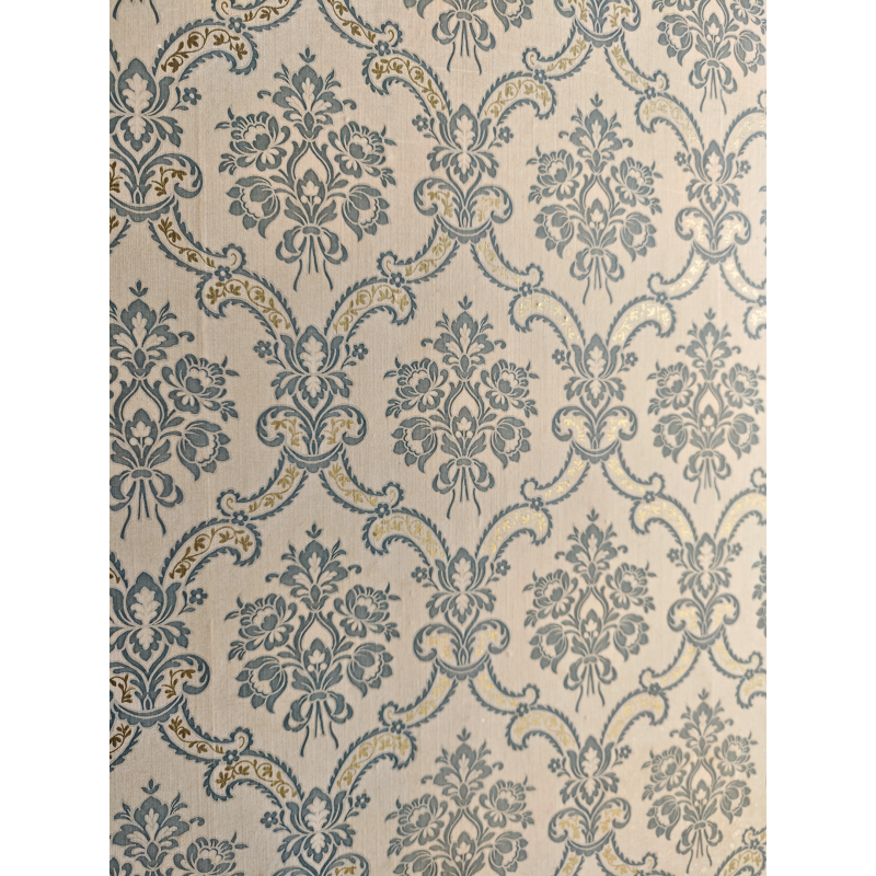 - Face 1 : papier peint à motifs floraux stylisés, dans des tons doux bleu/gris et doré, très élégant
