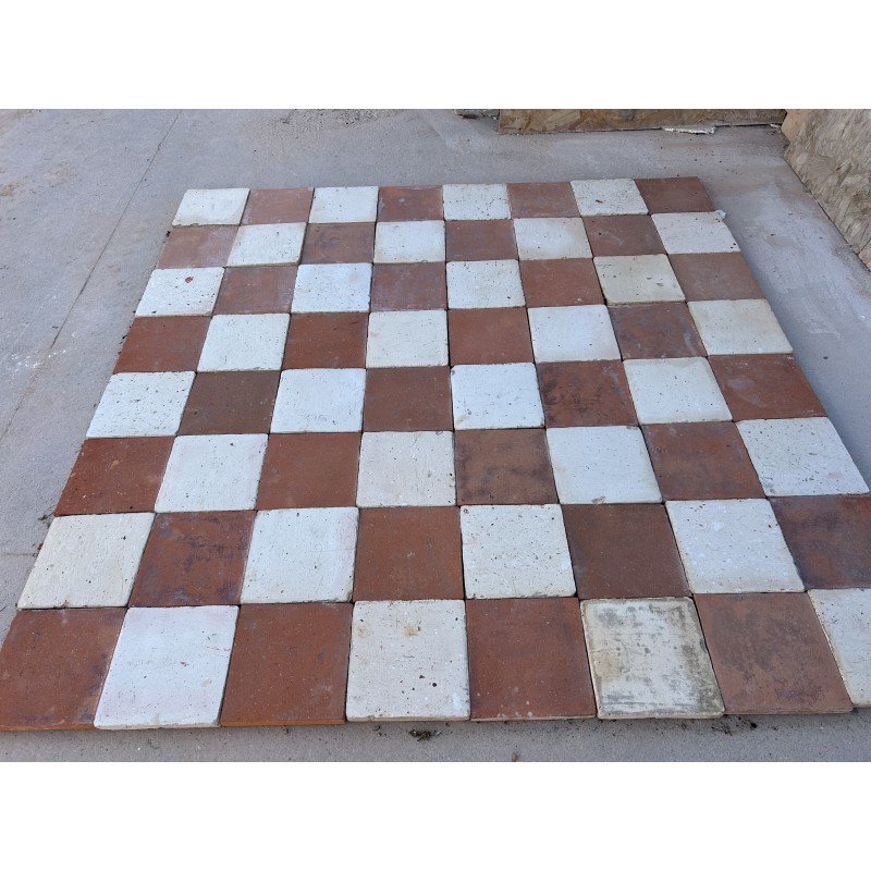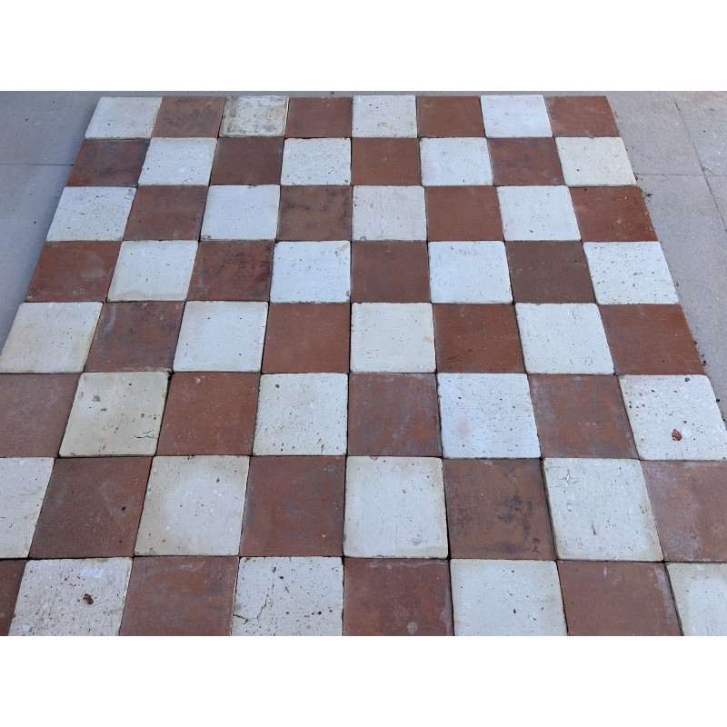 Damier ancien rouge et blanc en terre cuite (24 X 24). Épaisseur : 3 cm. Prix : 90,00 € HT/m². 50 m² disponibles.